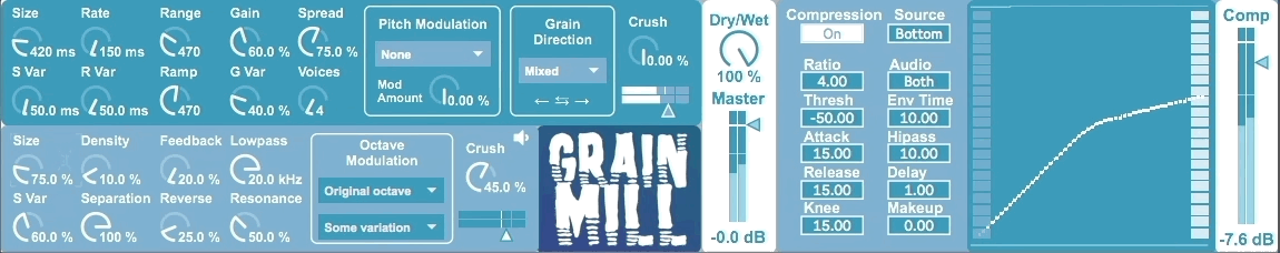 Grain Mill is a granular delay that uses two asynchronous granulator objects for that delicious fragmenting of realtime audio input à la Christian Fennesz and Tim Hecker. The audio channels can be mixed against the dry signal, and the master output can be further contoured by the additional side-chain compressor.at the end of the signal. For the connoisseur of the unusual, this is a multi-course meal of strange.